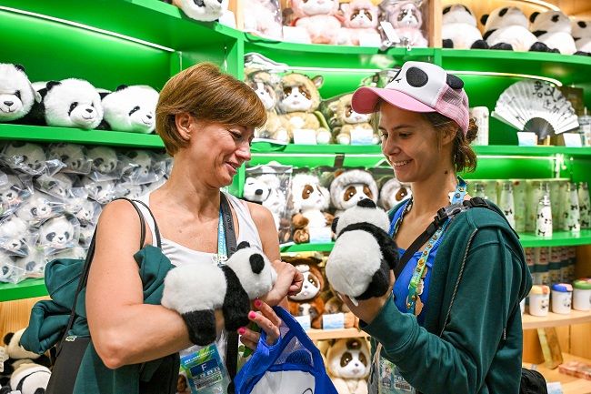 8月1日,参加第31届世界大学生夏季运动会的大学生运动员们参观成都大熊猫繁育研究基地。图为匈牙利选手凡妮·皮格尼茨基(右)选购大熊猫玩偶。(图片来源:中新社)