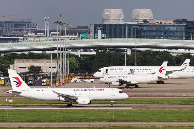 8月2日,东航第二架注册号为B-919C的国产C919大型客机,从上海虹桥机场起飞。(图片来源:中新社)