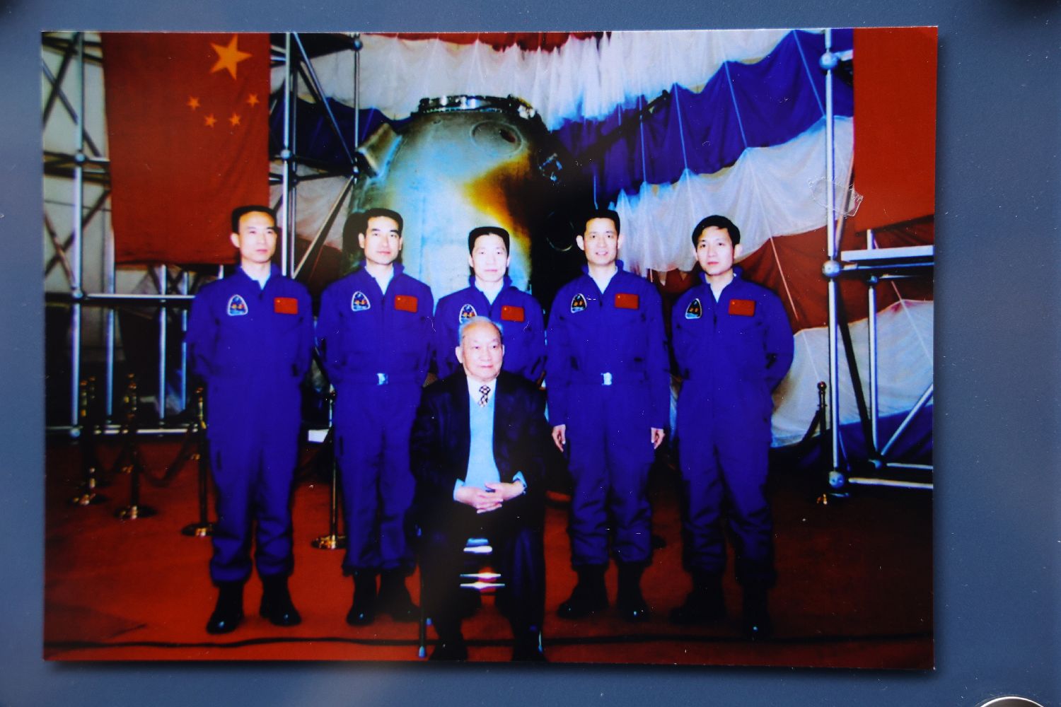 2003年,神舟五号载人飞船发射成功后,梁思礼与杨利伟等五名中国宇航员在发射舱前的合影(翻拍)。(图片来源:李铎 摄)