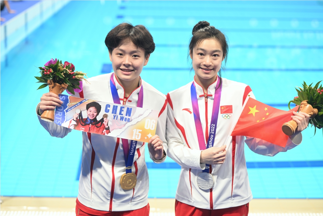 跳水比赛收官日,中国选手杨昊、白钰鸣和陈艺文、昌雅妮分别获得男子单人10米跳台和女子单人3米跳板金银牌。至此,中国跳水队席卷了本届亚运会跳水比赛的全部10枚金牌,且包揽了6个单人项目的冠亚军。