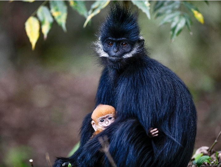 图为4月30日拍摄的贵州麻阳河中国国家级自然保护区的黑叶猴及幼猴。2004年,保护区被纳入中国生物圈保护区网络。(图片来源:新华社)