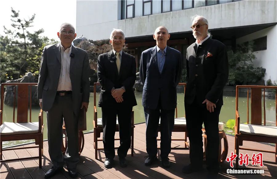 图为倪豪士(右一)、稻畑耕一郎(左二)、魏让方(左三)、徐健(左一)11月6日在中国人民大学苏州校区内合影。(图片来源:中新网)