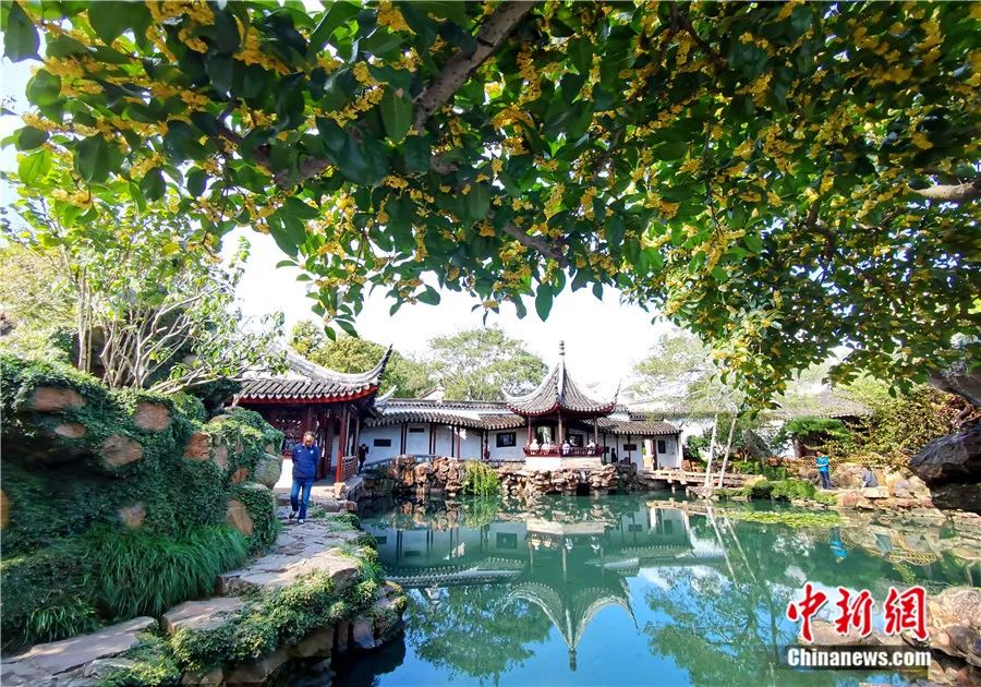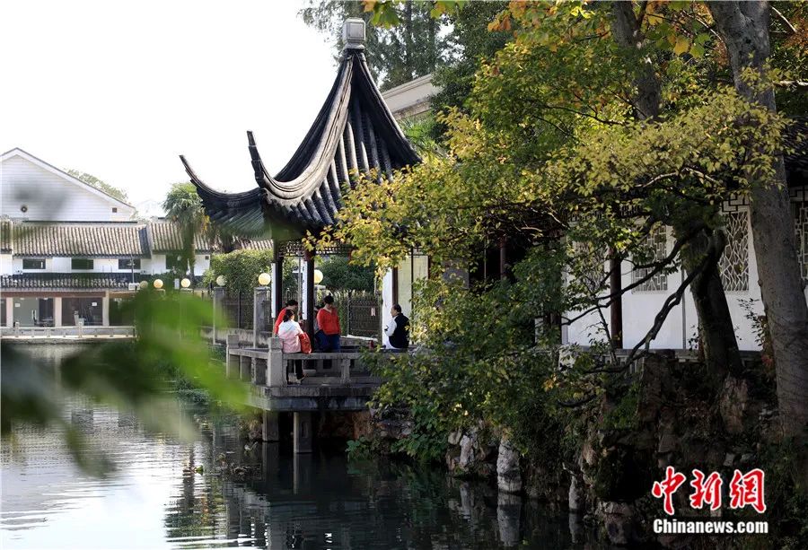 图为苏州园林里,银杏、红枫、乌桕等古树名木霜染如花,并与池水、亭台楼阁交相辉映。(图片来源:中新网资料图)