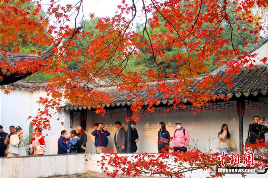 图为游客在苏州拙政园内赏枫。(图片来源:中新网资料图)