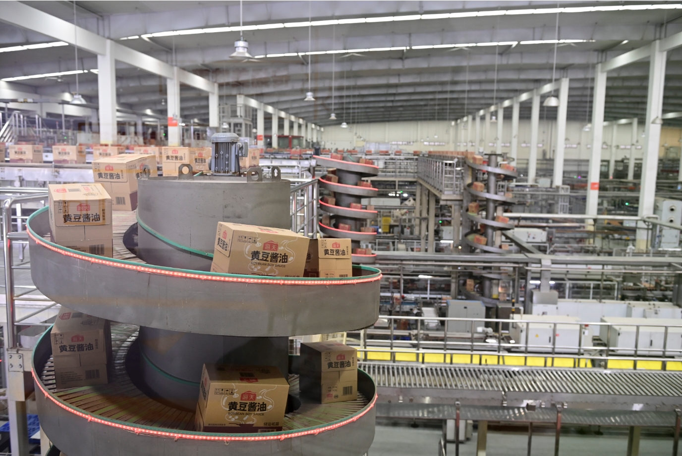 广东佛山市海天调味食品有限公司是中国商务部公布的首批“中华老字号”企业之一。图为装箱后的海天酱油自动运输。(图片来源:中新社)