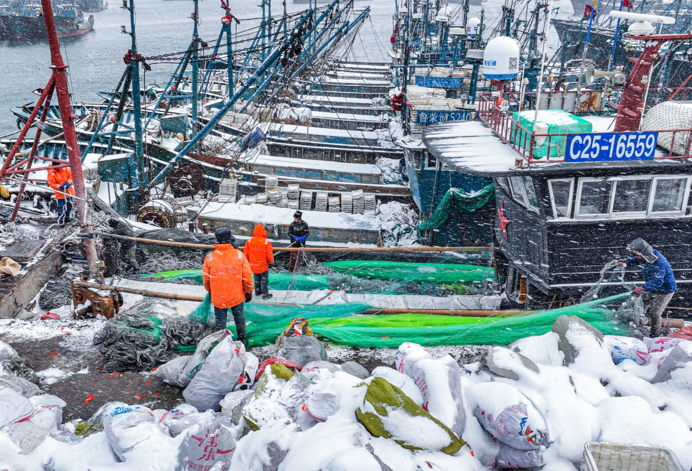 山东省荣成市16日出现大风和强降雪天气,渔船纷纷停靠渔港,躲避风雪。(图片来源:中新社)