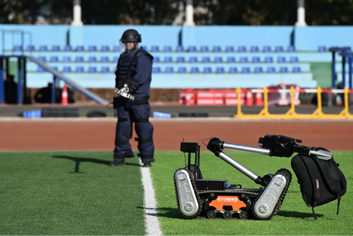 内蒙古呼和浩特举行应急处突拉动演练。图为排爆机器人进行排爆演练。(图片来源:中新社资料图)