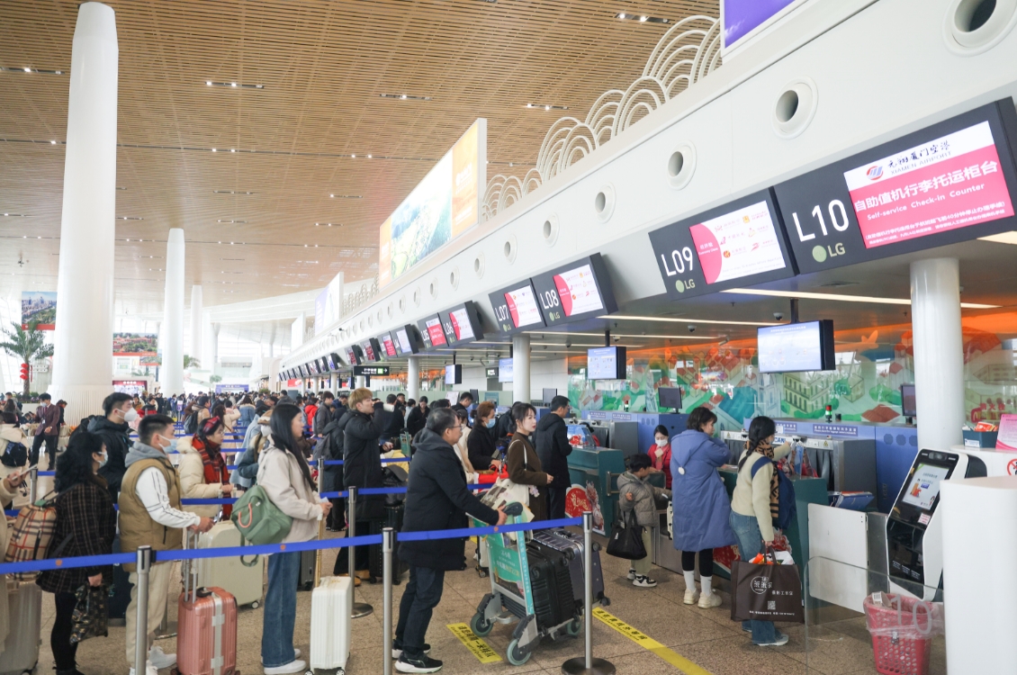 图为1月28日,旅客在厦门高崎国际机场办理值机手续。(图片来源:中新社)