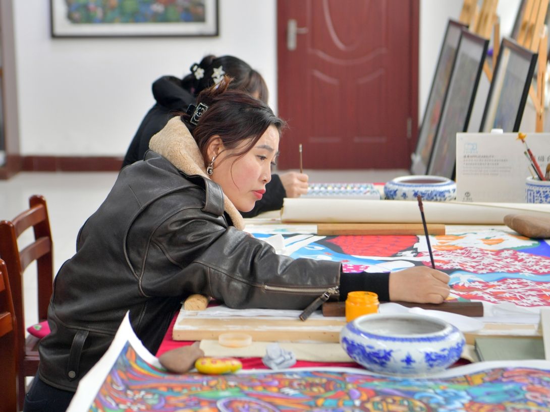 2月28日,吉林省桦甸市公吉乡,农民在农闲时聚在一起创作农民画。(图片来源:中新社)