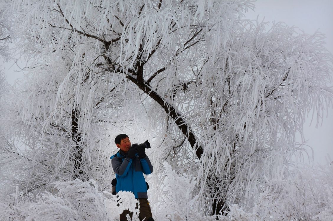 2023年12月,齐双在吉林省蛟河市拉法山拍摄雾凇景观。(图片来源:中新社)