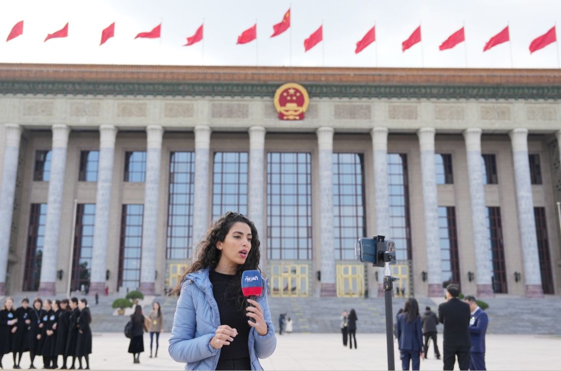 3月11日,十四届全国人大二次会议在北京人民大会堂举行闭幕会。图为外国记者报道闭幕会。(图片来源:中新社)