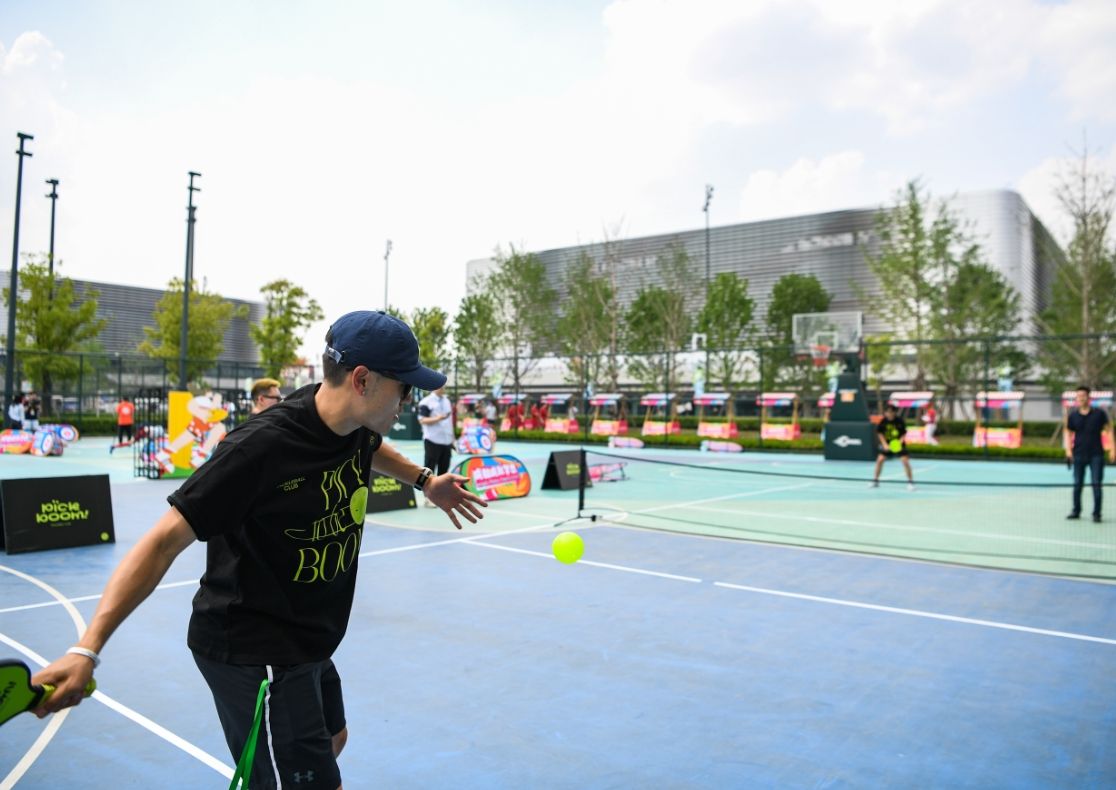 在四川成都东安湖体育公园,体育爱好者在“潮流运动会”上打匹克球。(图片来源:新华社资料图)