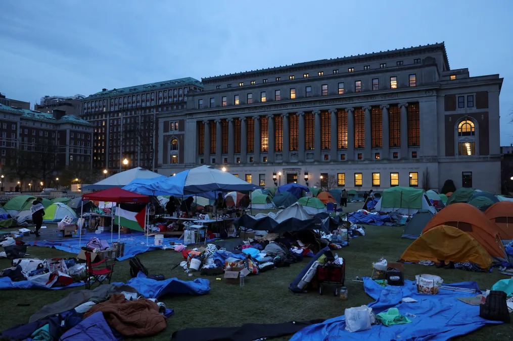 经过一晚紧张的谈判后,4月24日,抗议者继续维持纽约市哥伦比亚大学校园内的营地。凯特琳·奥克斯/路透社