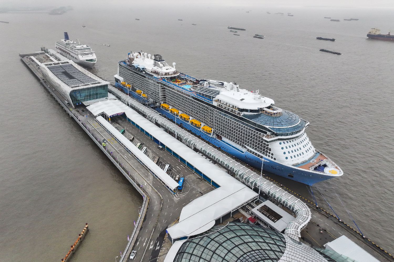 4月26日,超大国际邮轮“海洋光谱号”回归阔别4年多的上海母港。(图片来源:中新社)