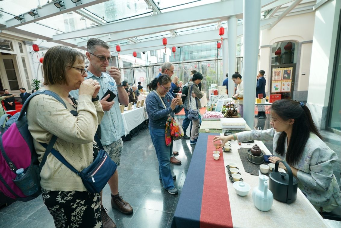 活动现场展示了云南华宁陶、竹编、云茶闻香系统等与茶相关的文化产品,并邀嘉宾近距离体验拓印、书法、茶道等非物质文化遗产,每个展台都围满热情参与的当地公众。来自中比两国的青年以茶为媒,以诗会友,共话友谊。