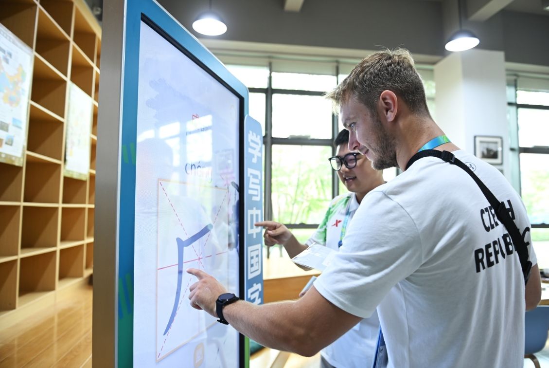 在成都大运会运动员村,捷克运动员使用电子屏学写汉字。(图片来源:中新社)