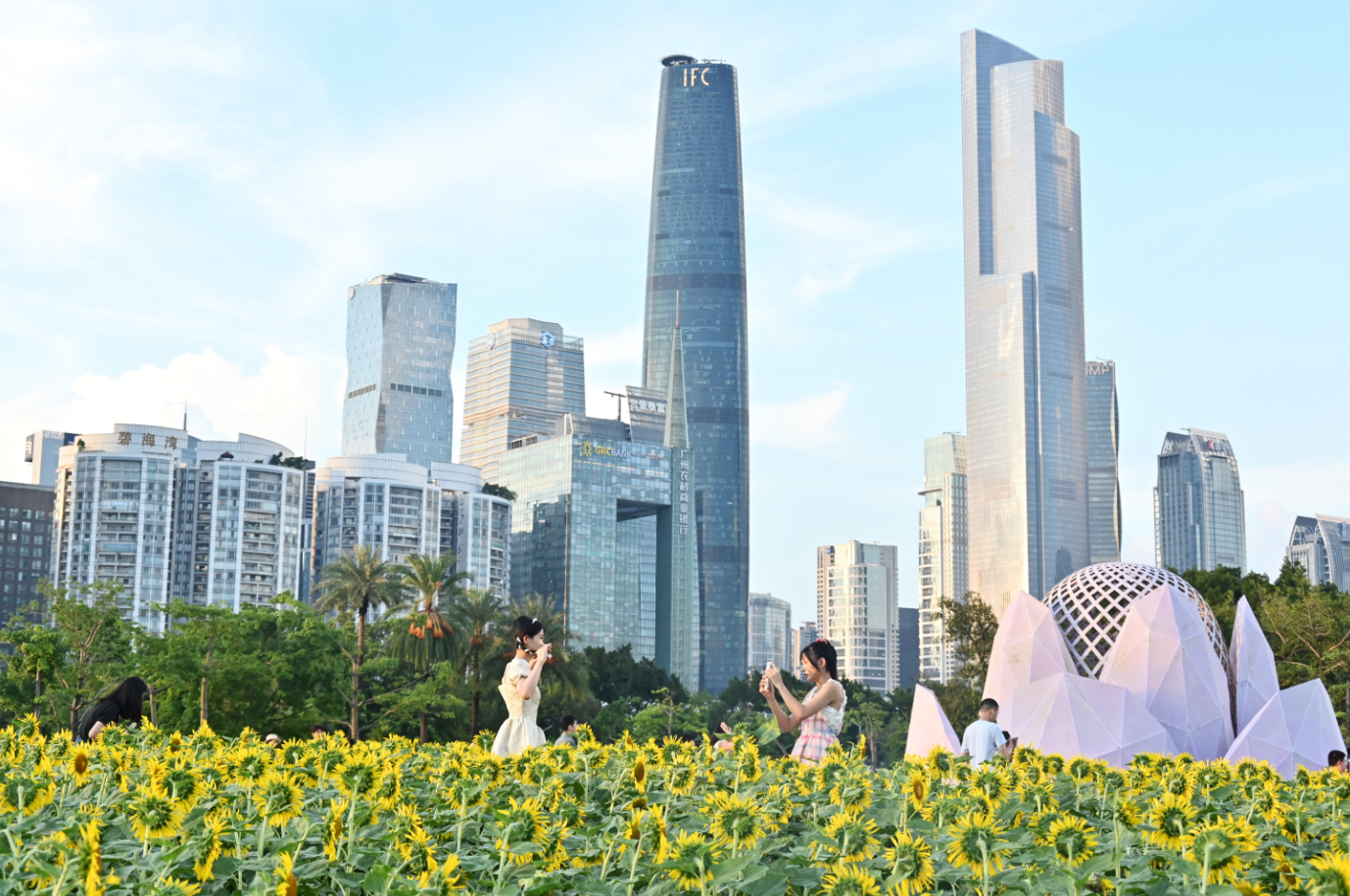 广州市宏城公园的向日葵花海吸引游人赏花拍照。(图片来源:中新社)