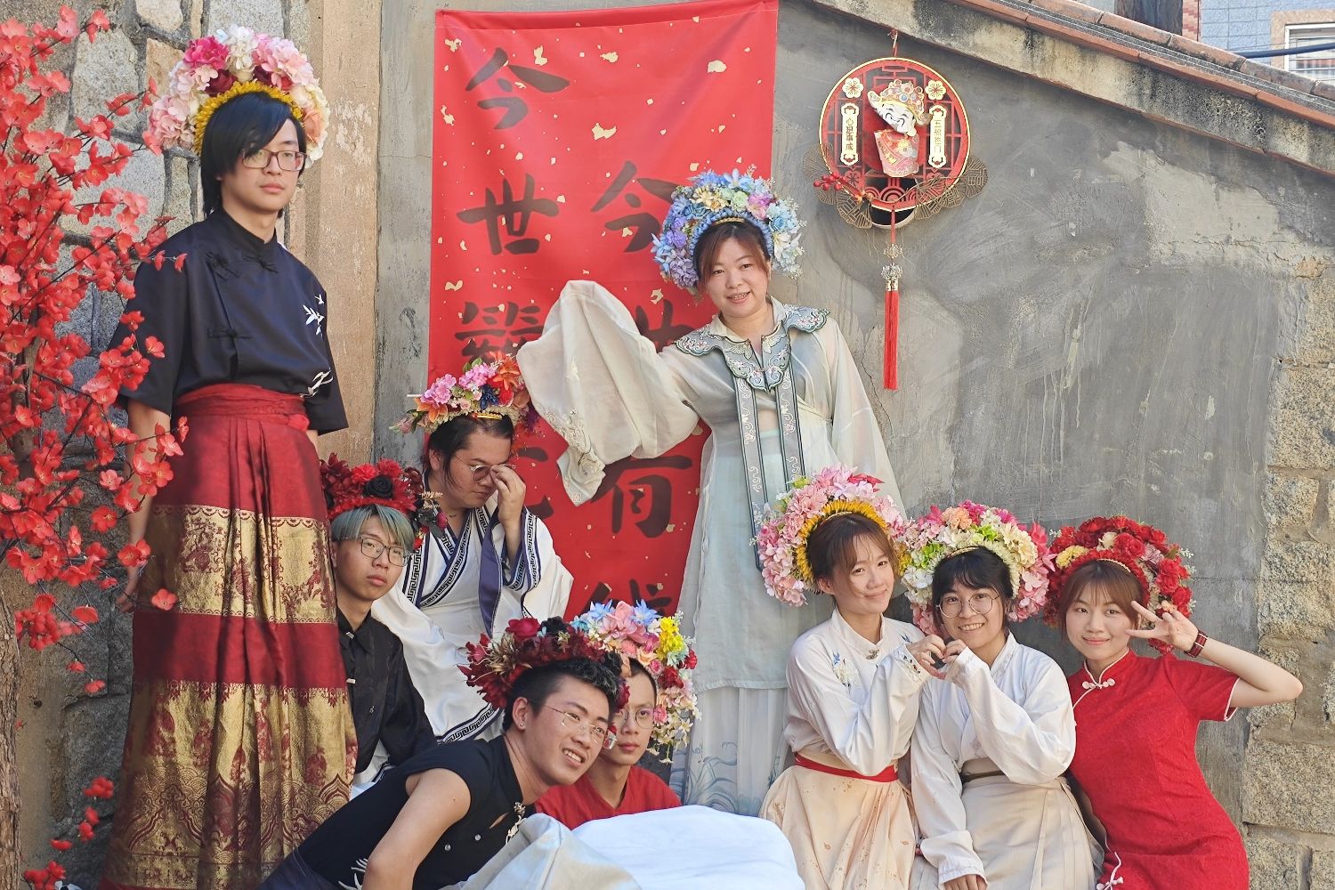 海峡两岸青年师生11日在泉州蟳埔民俗文化村,体验“簪花围”。(图片来源:中新社)