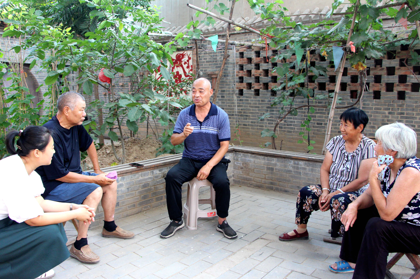 6月19日,在石家庄市藁城区常安镇耿村,耿村民间故事代表性传承人王发礼(中)给村民们讲故事。(图片来源:中新社)
