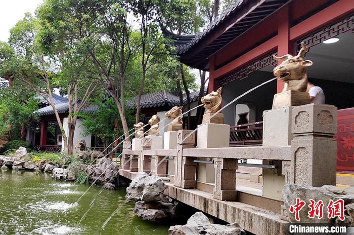 在乾隆行宫碑园池塘边,5尊仿制兽首同期向游客开放。(图片来源:中新网)