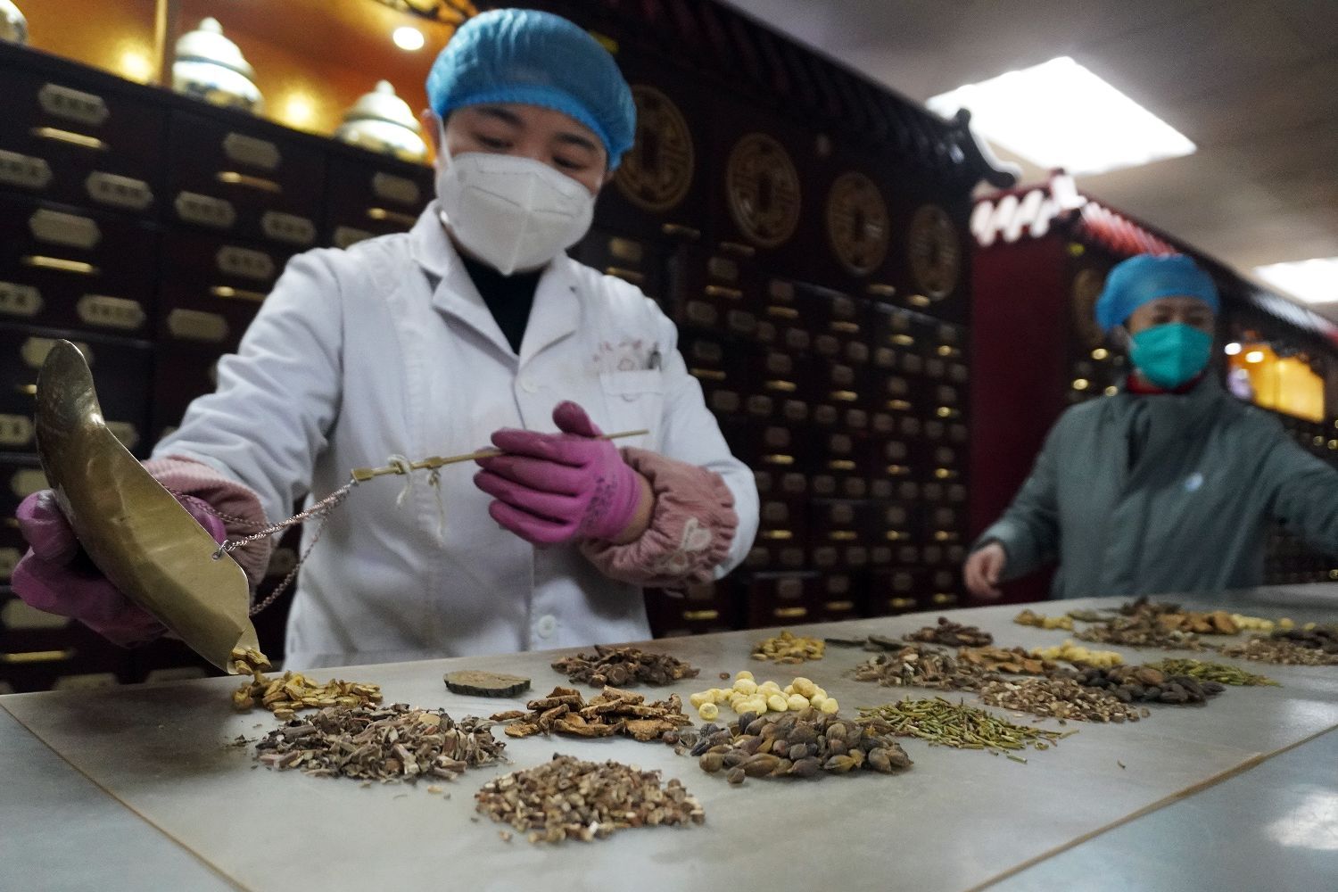 中药房工作人员正在调配中药。(图片来源:中新社资料图)