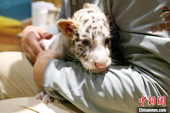 图为小白虎在工作人员怀抱里向游客“打招呼”。(图片来源:中新网)