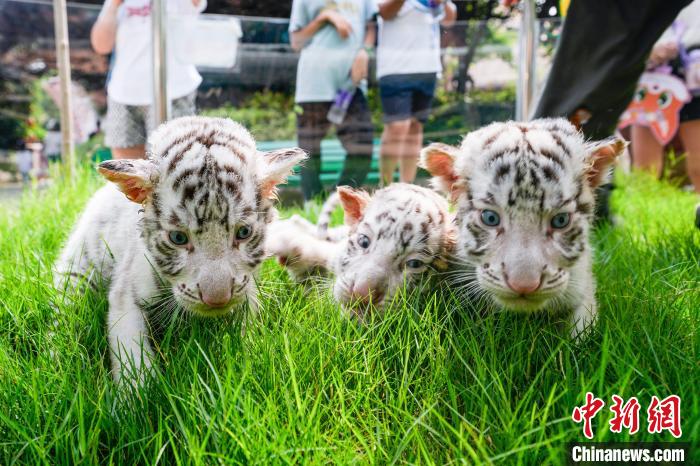 图为三只小白虎在草坪上玩耍。(图片来源:中新网)