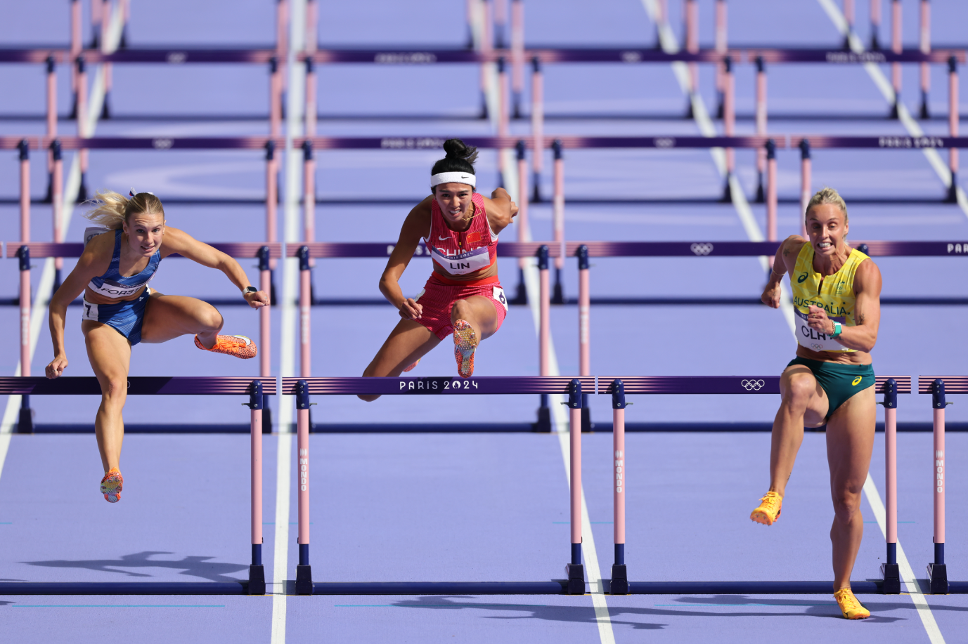 林雨薇(中)7日跑出13秒24列小组第7,将进复活赛。(图片来源:中新社)