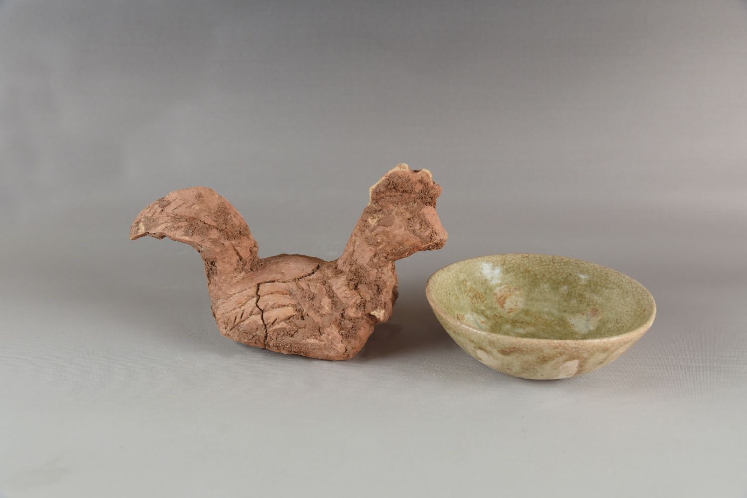唐代墓葬出土的陶鸡及青瓷碗。(图片来源:中新社)