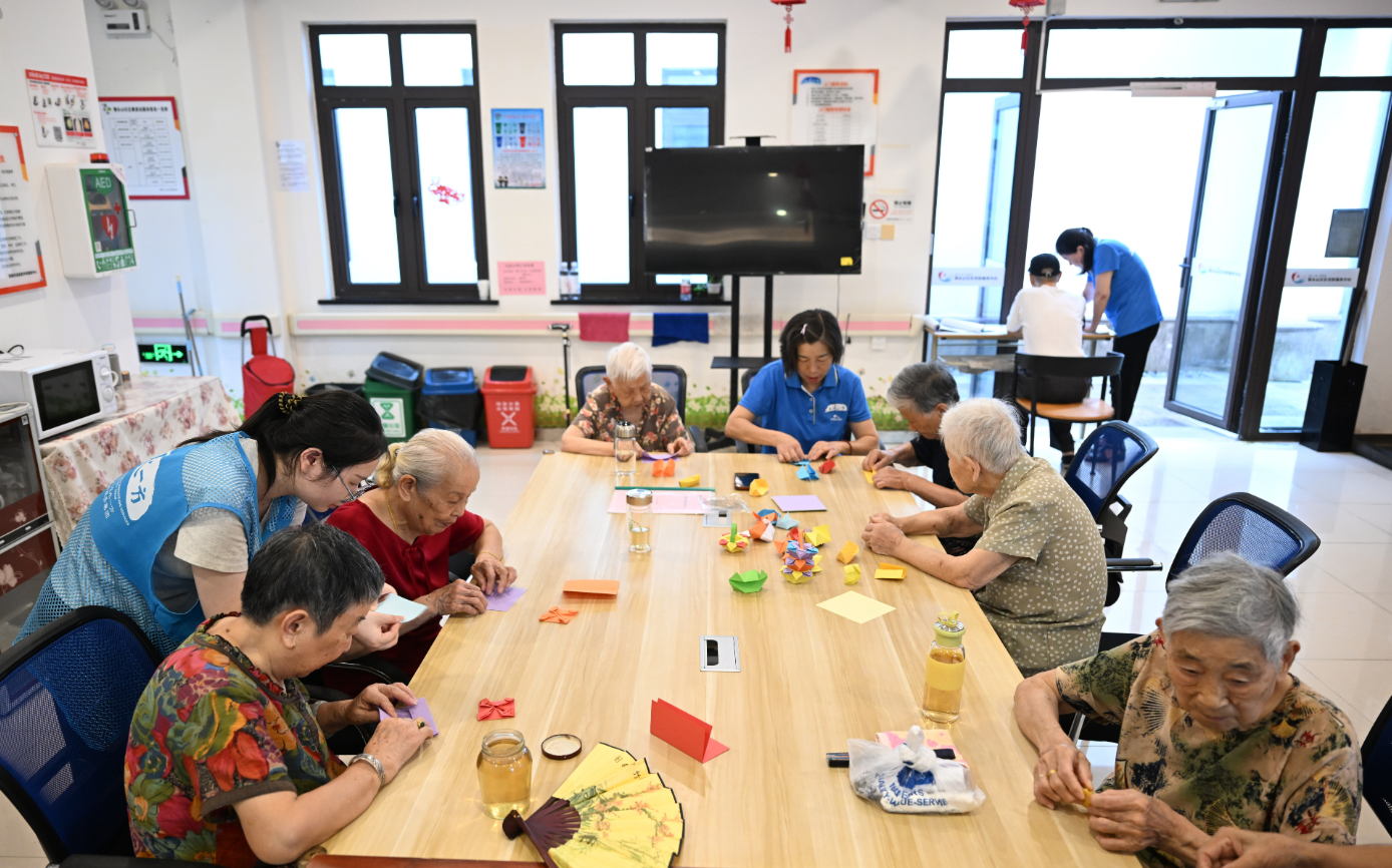 老人们在浙江杭州一养老院内进行手工制作。(图片来源:中新社)