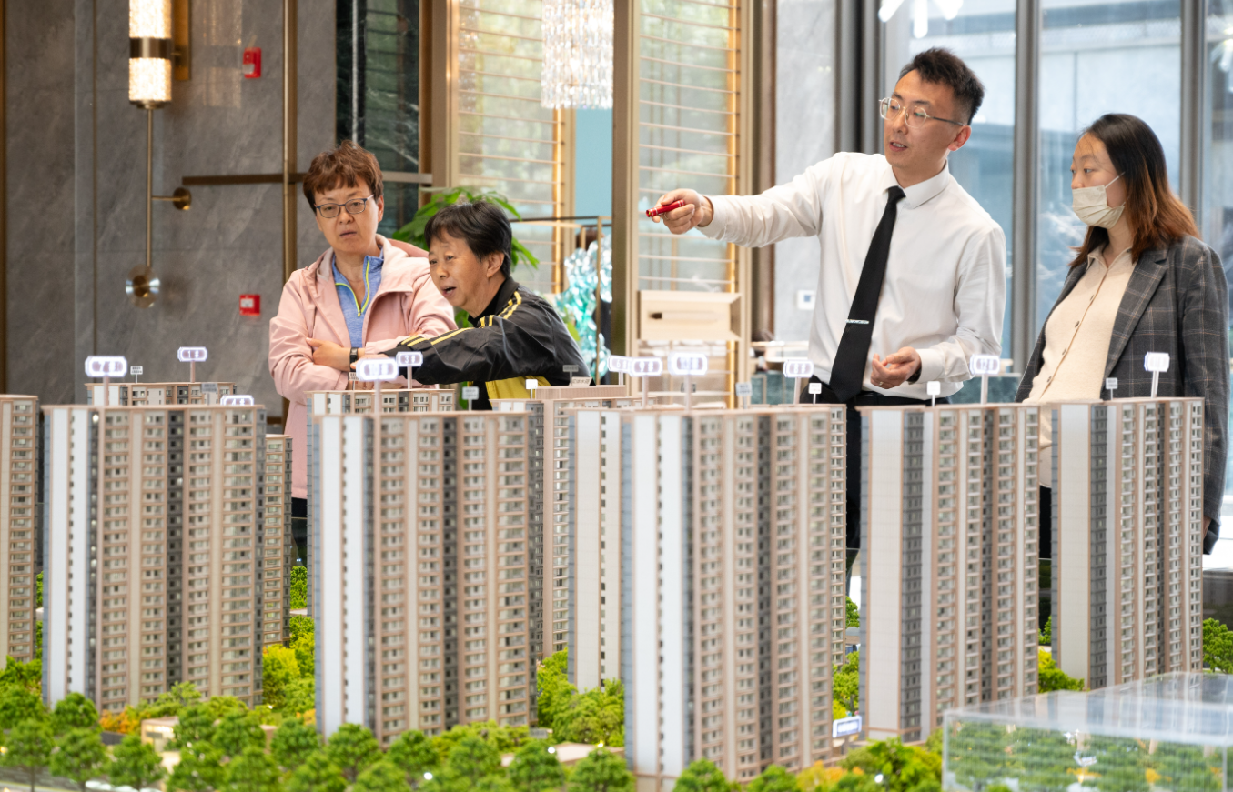 山西太原一售楼部置业顾问为市民推荐商品住宅。(图片来源:中新社资料图)