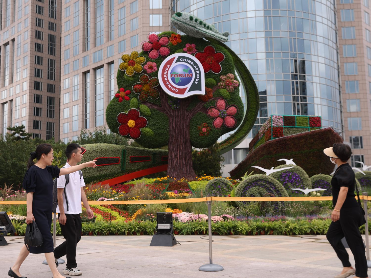 中非合作论坛峰会于9月4日至6日在北京举行。图为9月3日,北京西单路口的中非合作论坛主题花坛“共同发展”吸引市民。(图片来源:中新社)