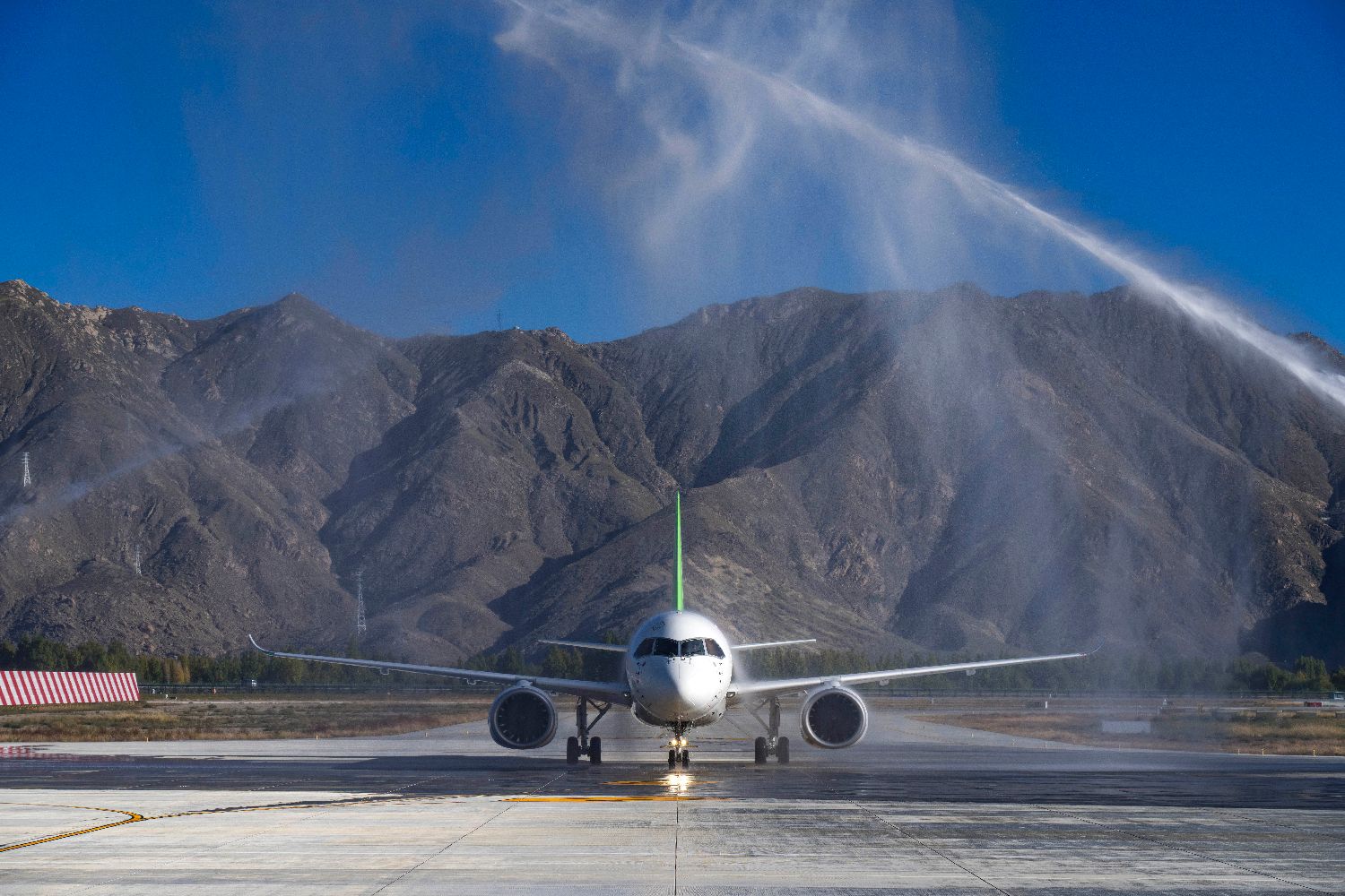 9月19日,中国商飞一架国产大型客机C919首飞拉萨,平稳降落在西藏拉萨贡嘎国际机场。(图片来源:中新社)