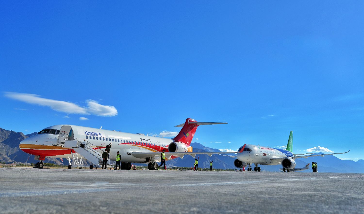 9月19日,中国商飞一架国产大型客机C919首飞拉萨,与正在进行“环青藏高原”演示飞行的国产支线客机ARJ21相聚于“世界屋脊”之上。(图片来源:中新社)