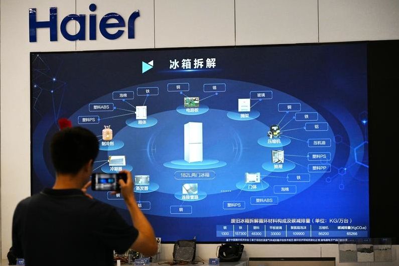 海尔胶州空调青岛工厂获得“端对端灯塔”称号。图为9月27日,参观者在海尔绿色再循环互联工厂展厅内拍摄。(图片来源:新华社)