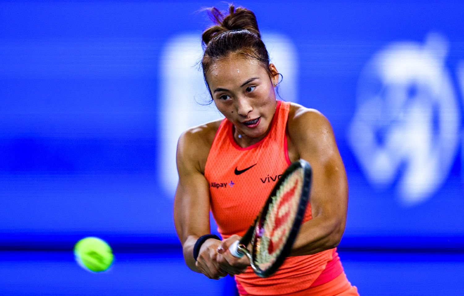 北京时间10月12日晚,2024年武汉网球公开赛展开女单半决赛的争夺,中国选手郑钦文以2:0战胜中国选手王欣瑜晋级决赛。图为郑钦文在比赛中回球。(图片来源:中新社)