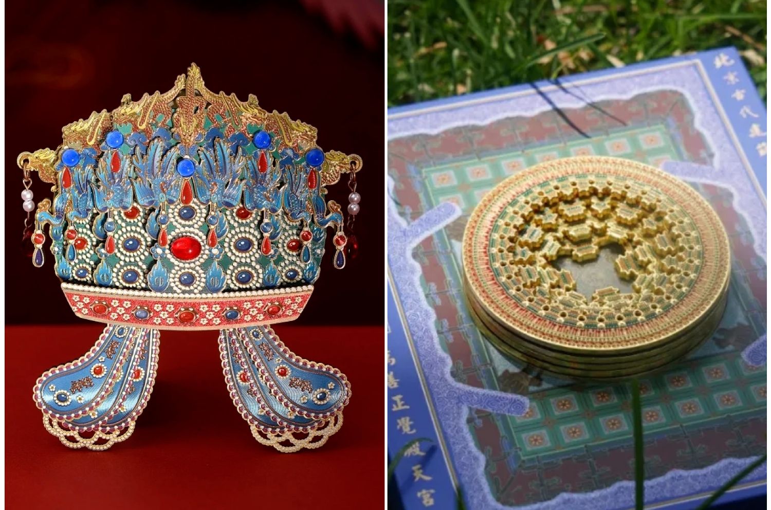 左为中国国家博物馆凤冠木质冰箱贴。右为天宫藻井冰箱贴。(图片来源:均据中新社)