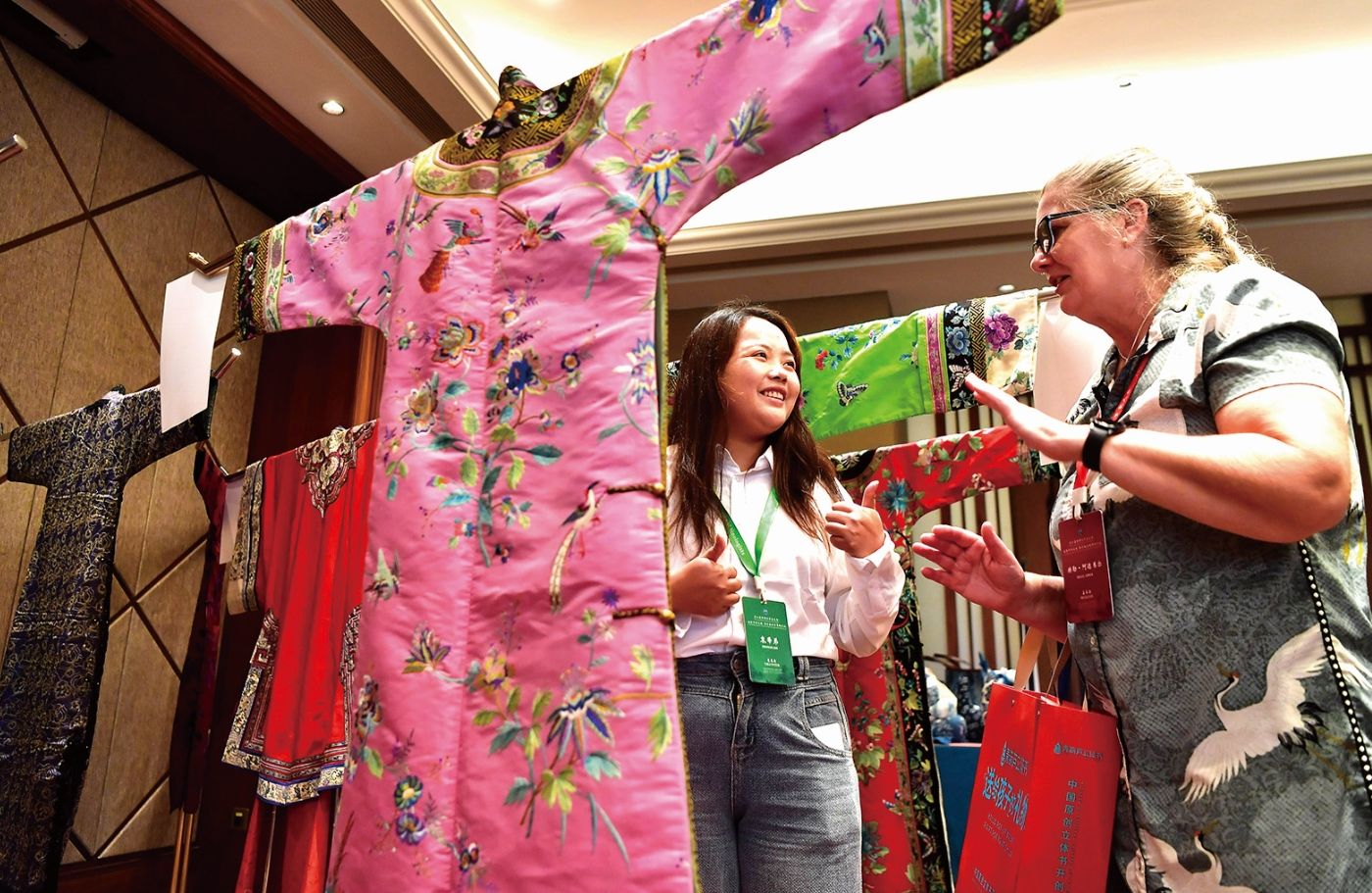 10月27日,活动上举行的非物质文化遗产项目展示吸引许多参会嘉宾前来参观体验。(图片来源:中新社)