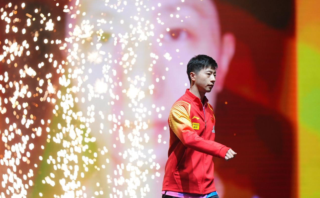 10月5日,在北京举行的2024年世界乒乓球职业大联盟(WTT)中国大满贯男子单打半决赛中,中国选手马龙4比0胜队友梁靖崑,晋级决赛。图为马龙登场亮相。(图片来源:中新社)