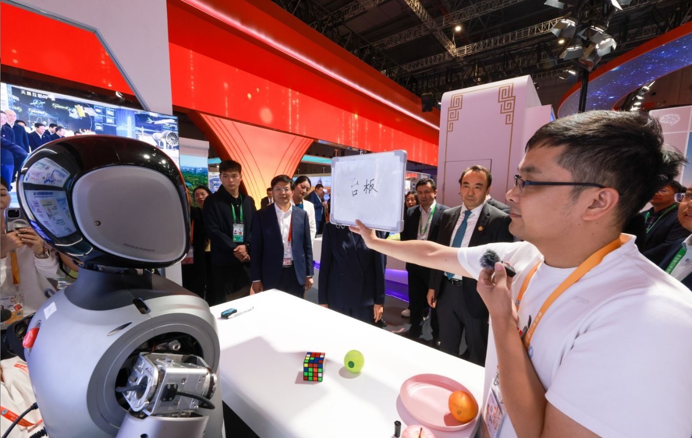 中国馆一名展台负责人5日演示机器人识别手写字。(图片来源:中新社)