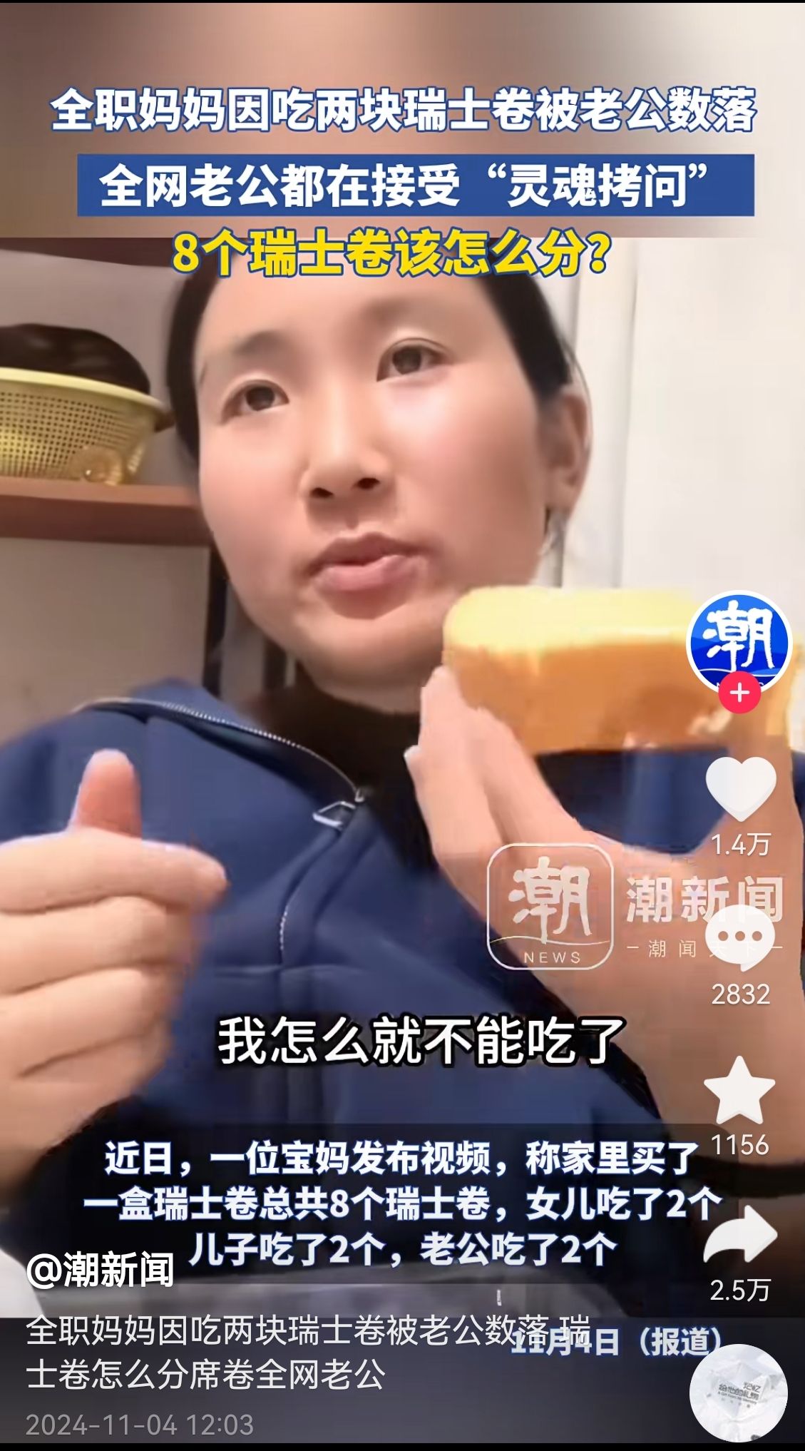 一全职妈妈因为吃两块瑞士卷被老公数落的视频在互联网上掀起了巨大波浪。(图片来源:杭州潮新闻官方抖音)