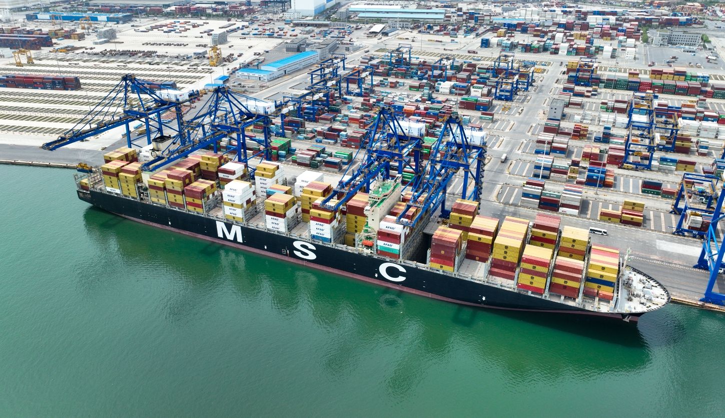 5月8日,“地中海凯蒂”(MSC KATIE)轮在辽宁港口集团大连集装箱码头首航,标志着大连港——地中海西岸航线正式开通。图为“地中海凯蒂”(MSC KATIE)轮。(图片来源:中新社)