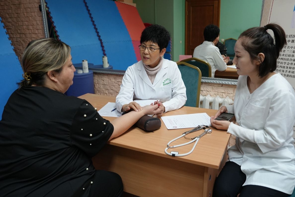 当地时间11月10日,哈萨克斯坦阿斯塔纳,中国—哈萨克斯坦传统医学中心义诊暨第二届传统医学文化宣传周活动启幕。图为义诊活动现场,中医医生(中)在翻译的帮助下为患者诊疗。(图片来源:中新社)