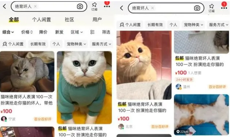 在闲鱼上,输入“绝育坏人表演”,跳出了近千条相关的发布信息,服务报价从50元至100元不等,也有按距离收费服务。