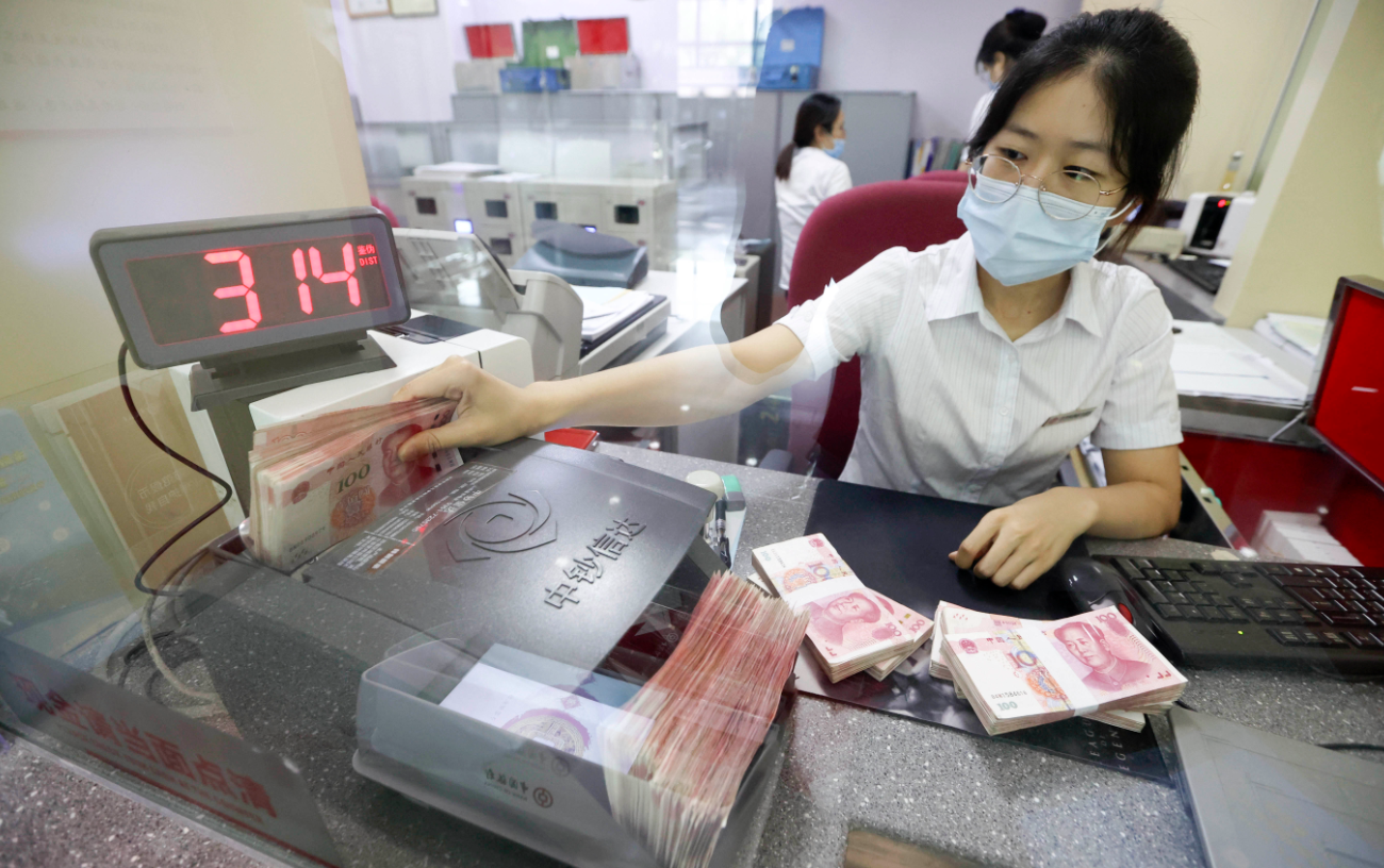 山西省太原的银行工作人员在清点货币。(图片来源:中新社资料图)