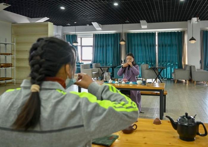 江苏省镇江市残疾人托养中心于2015年启用,现有学员90名,全部为轻度智力障碍人员。图为11月26日,学员跟随老师学习茶文化。(图片来源:新华社)