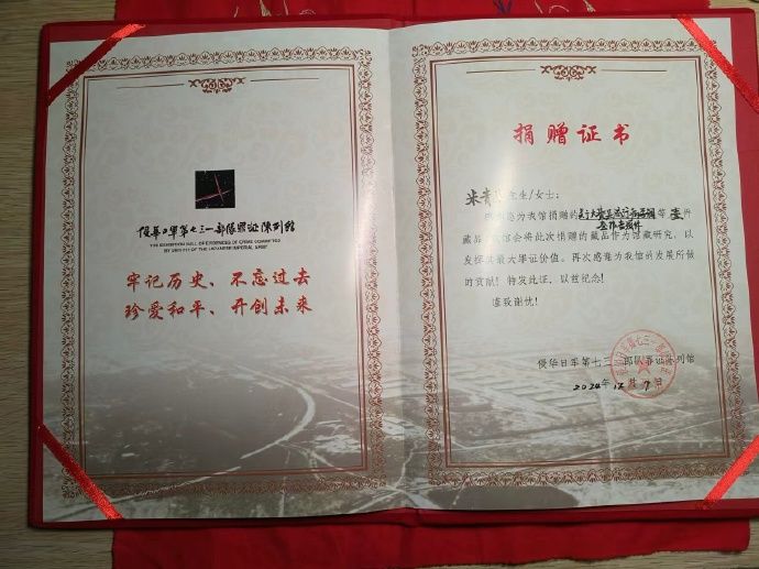 图为大学生收到的捐赠证书。(图片来源:侵华日军第七三一部队罪证陈列馆官方微博)