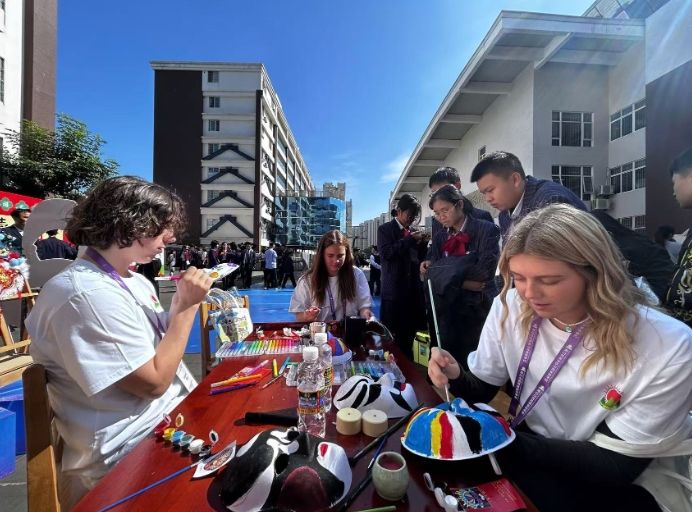 12月16日,海南海口,美国青少年走进海口山高高级实验中学体验中国戏曲脸谱绘制。(图片来源:中新社)