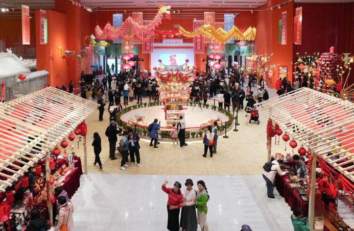 中新社报道,现场共展示120余项与春节相关的非物质文化遗产代表性项目,展览叙事从冬至开始,至元宵节结束,分为序厅和辞旧迎新、欢聚祝福、乐岁弦歌和普天同庆四个主题单元。登上二层观景廊道,热闹景象尽收眼底,琳琅满目的庙会街市,尽情歌舞的乡村春晚,怀仁旺火“熊熊燃烧”预示来年旺气冲天。