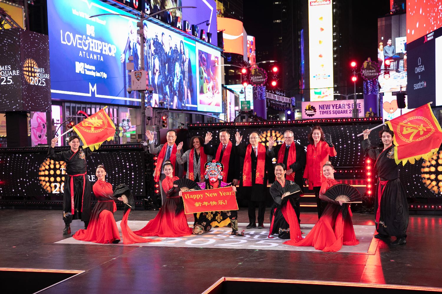 当地时间2024年12月31日,纽约市一年一度的时报广场跨年夜庆祝活动举行。当晚的活动以“品味非遗·喜迎春节”文艺表演拉开序幕。图为中国驻纽约总领事陈立(后排左三)与表演者合影。(图片来源:中新社)